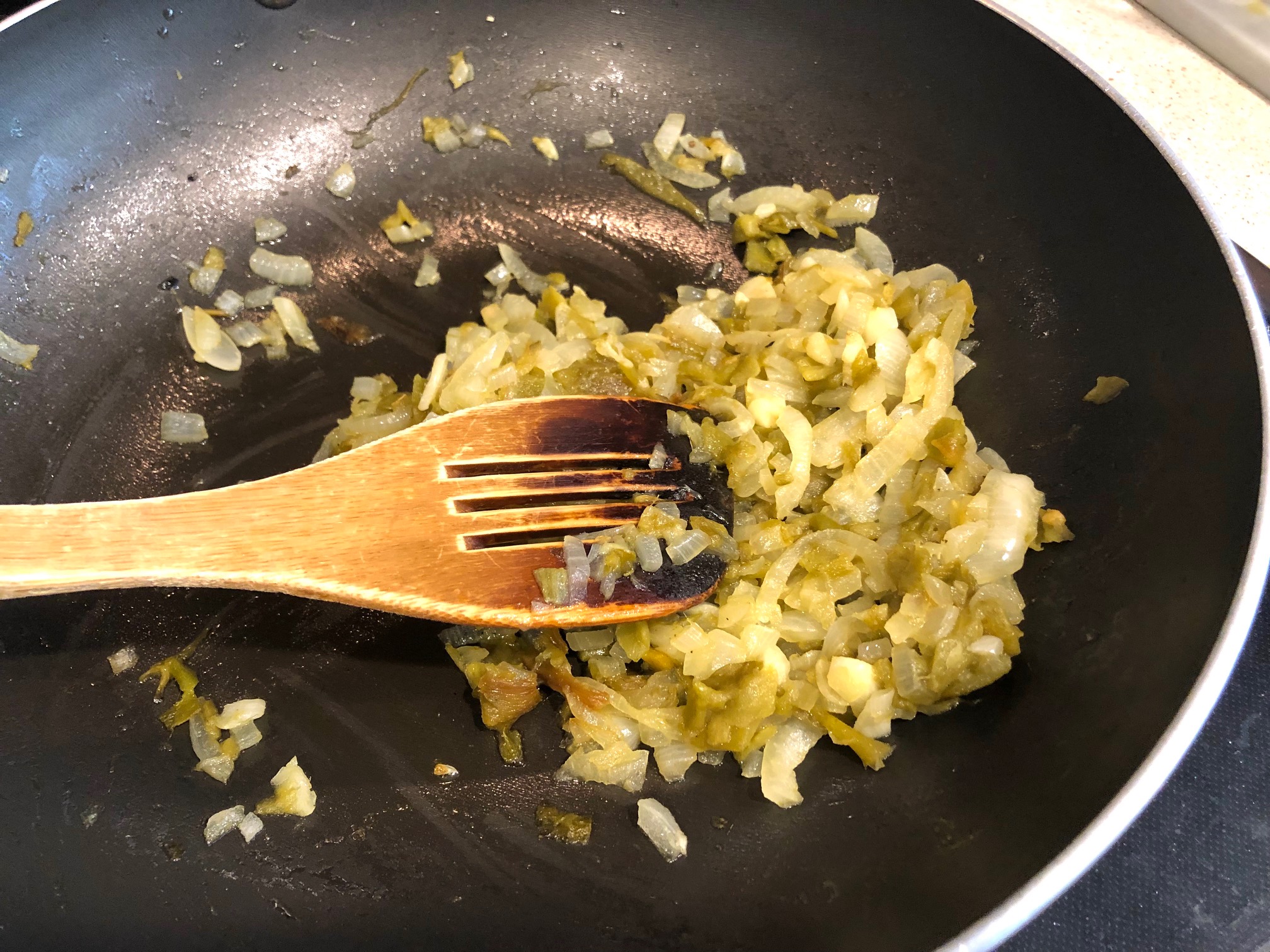 Make the filling: Heat oil in a large, high-sided skillet over medium heat. Sauté the onions, stirring occasionally, until very soft, about 10 minutes. Add 1/2 cup of the chopped chilies, and cook another 5 minutes, then stir in the garlic and cook until fragrant, about 3 minutes. Remove from heat and let cool.
