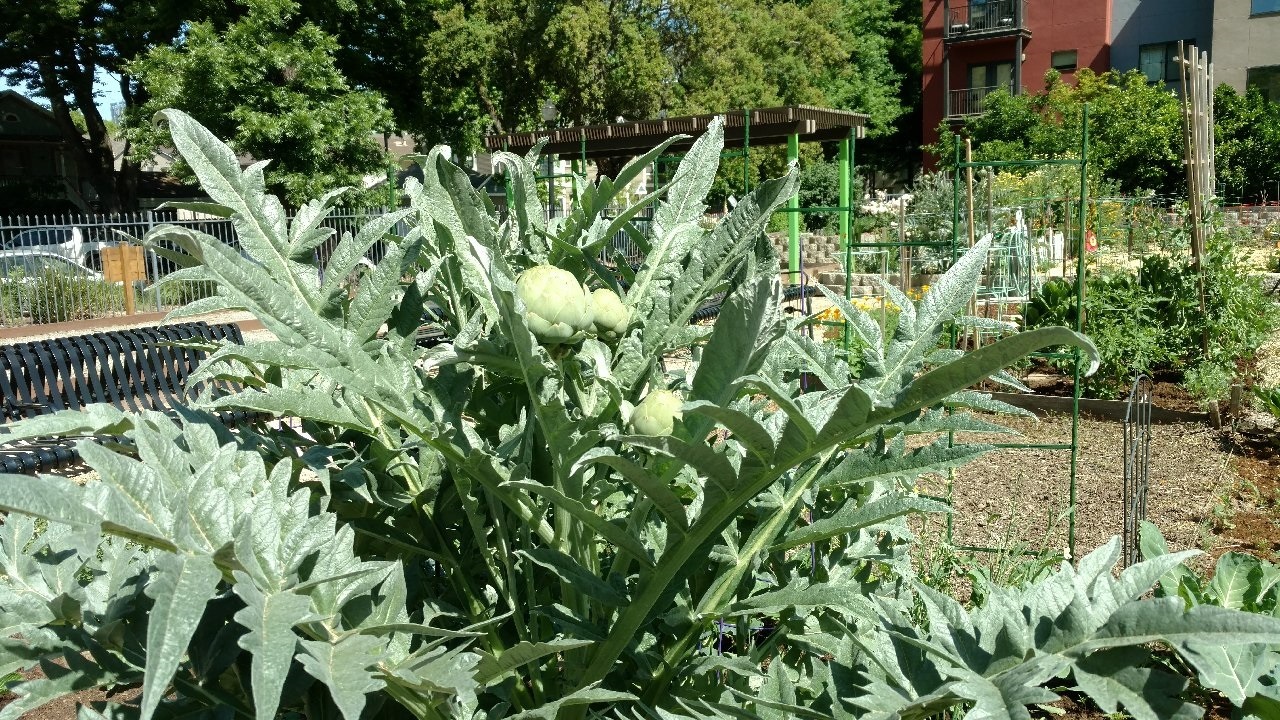 | This artichoke plant is a star at the Fremont Community Garden on Q Street in midtown. It is one of 17 community gardens operated by the City of Sacramento. (Photo by Debbie Arrington) |