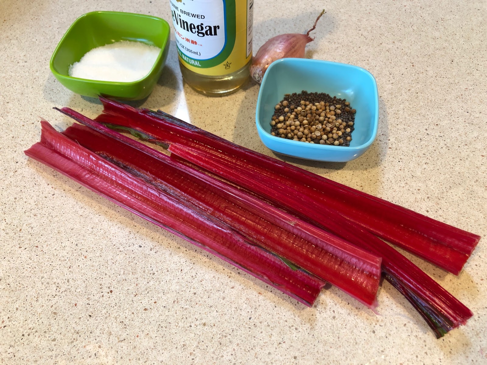 I hit on pickles, and have tried a couple of recipes now. The one here (adapted from an Epicurious recipe) is my favorite so far, with mustard seeds, coriander seeds and a shallot -- adding a lot of flavor to the gorgeous but rather bland chard stalk pieces.