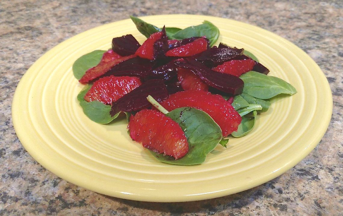 The beets and citrus top a bed of baby spinach; baby arugula, lettuce or other greens may be substituted, also.